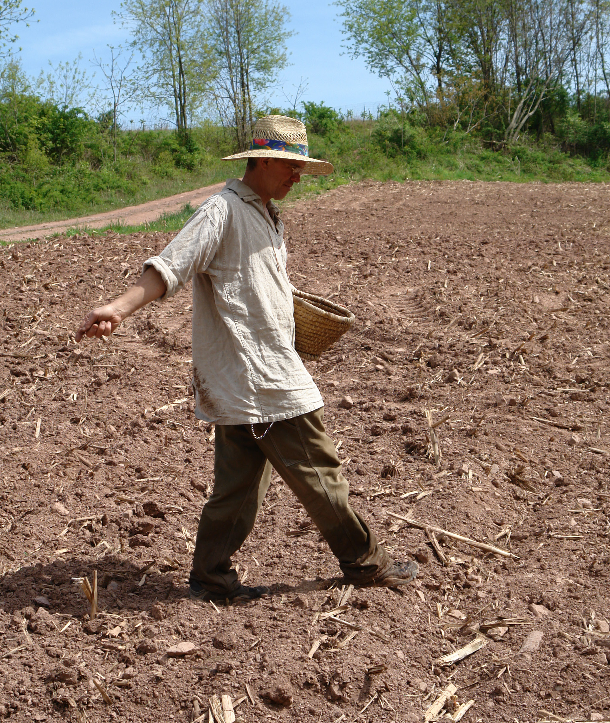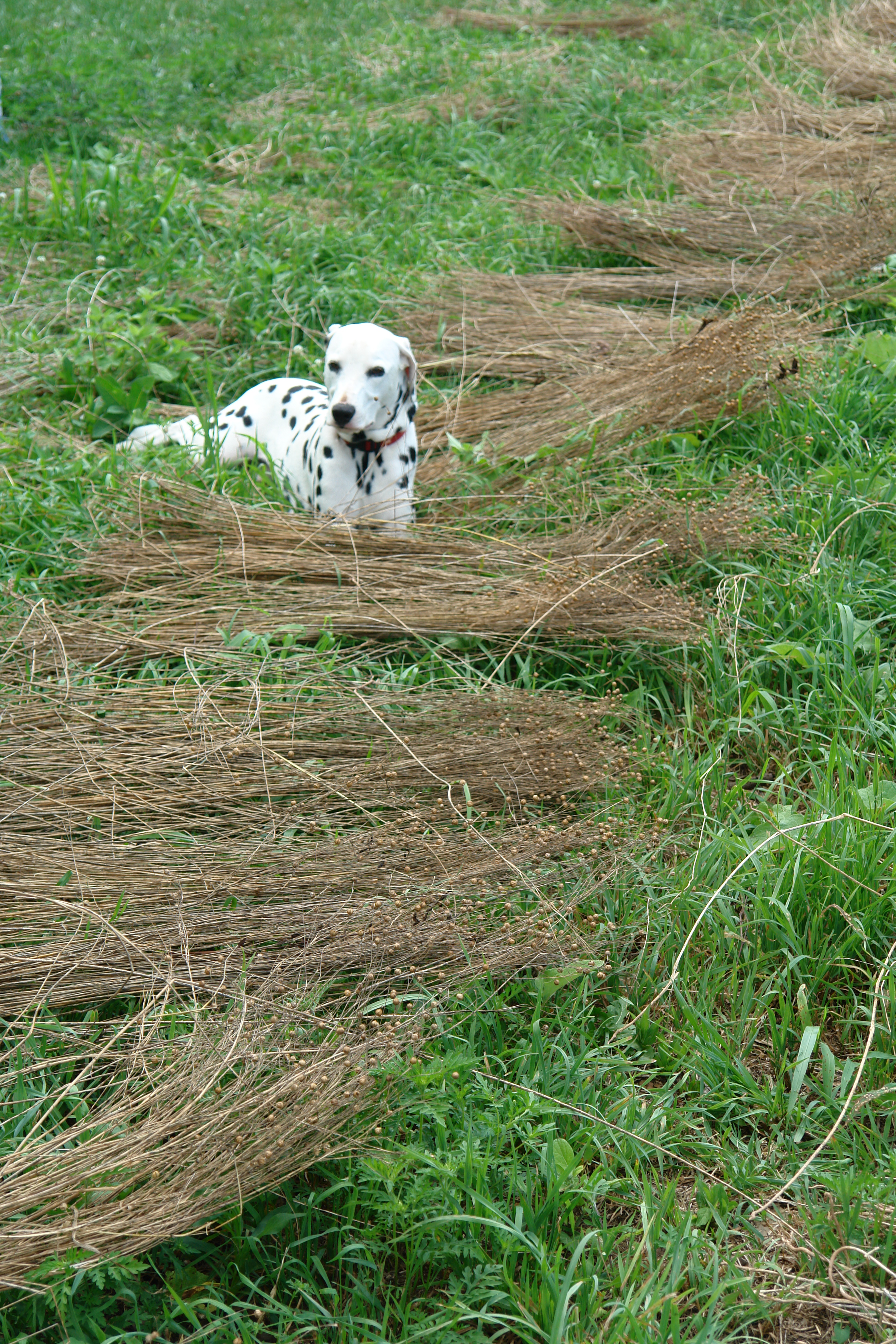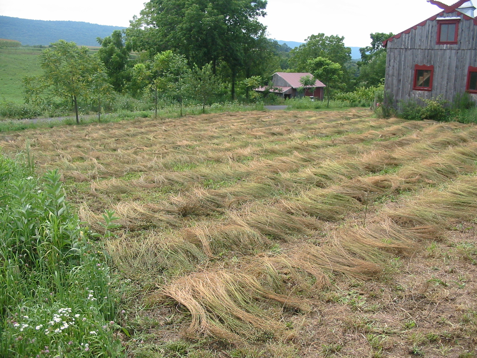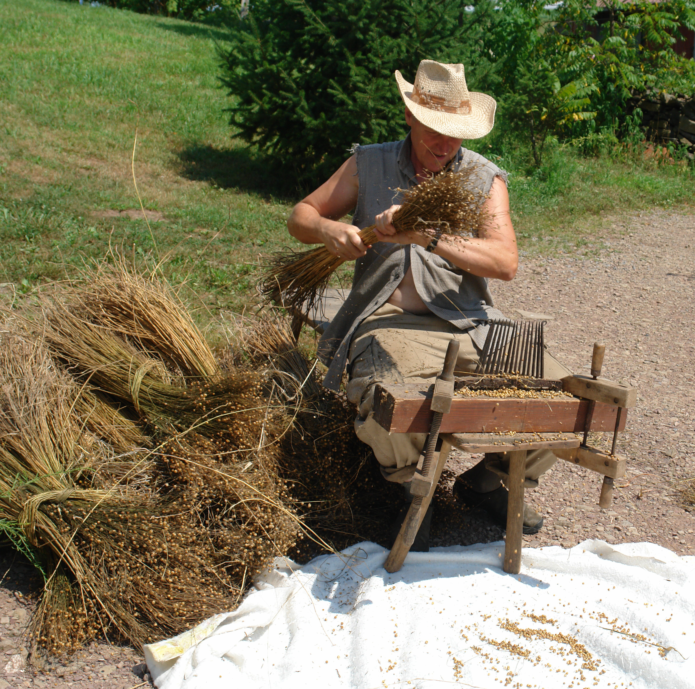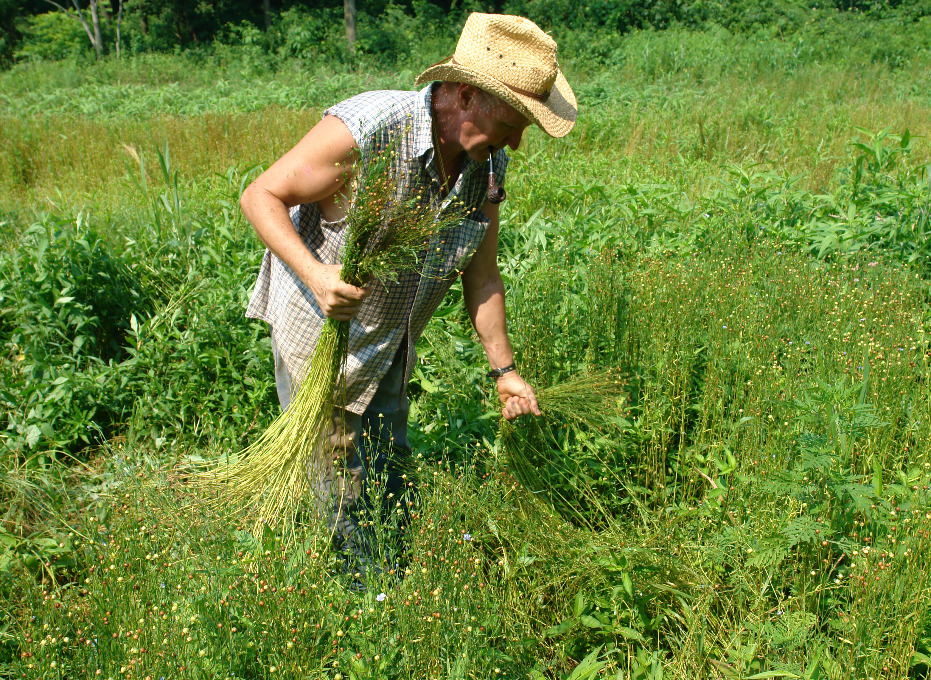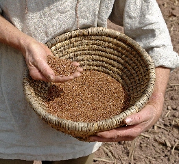 Flax was one of the earliest cultivated crops. The original wild version may have come from the Middle East, though it was also found in Europe. More than 10,000 years ago in the Swiss Lake region, for example, the entire green stalk was used for making baskets, much like rye straw baskets today. In fact, "flax" means to plait or braid to make baskets.Over winter, the stalks would rot and the long fibers that keep the plant upright would be freed from the stalk and could easily be twisted between the fingers into thread for sewing hides together into primitive clothing.